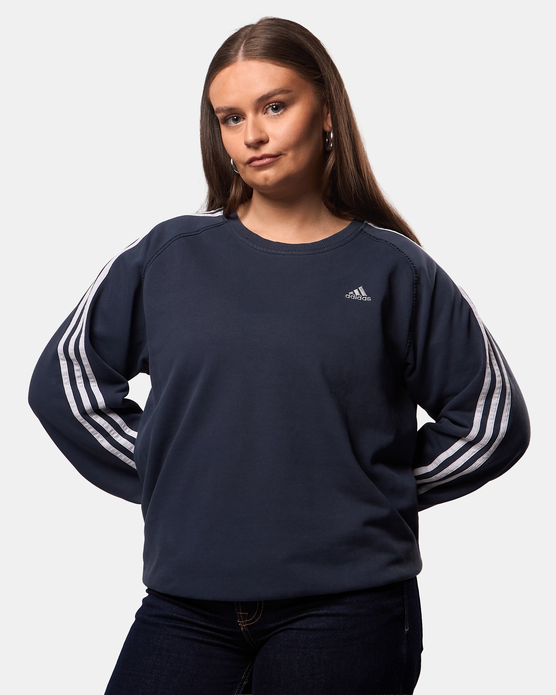 Everyday staple vintage Adidas sweatshirt. Navy tone with classic three stripe detailing down the sleeves, and small embroidered chest logo. Relaxed, comfortable and easy to style. The kind of piece that works with anything.