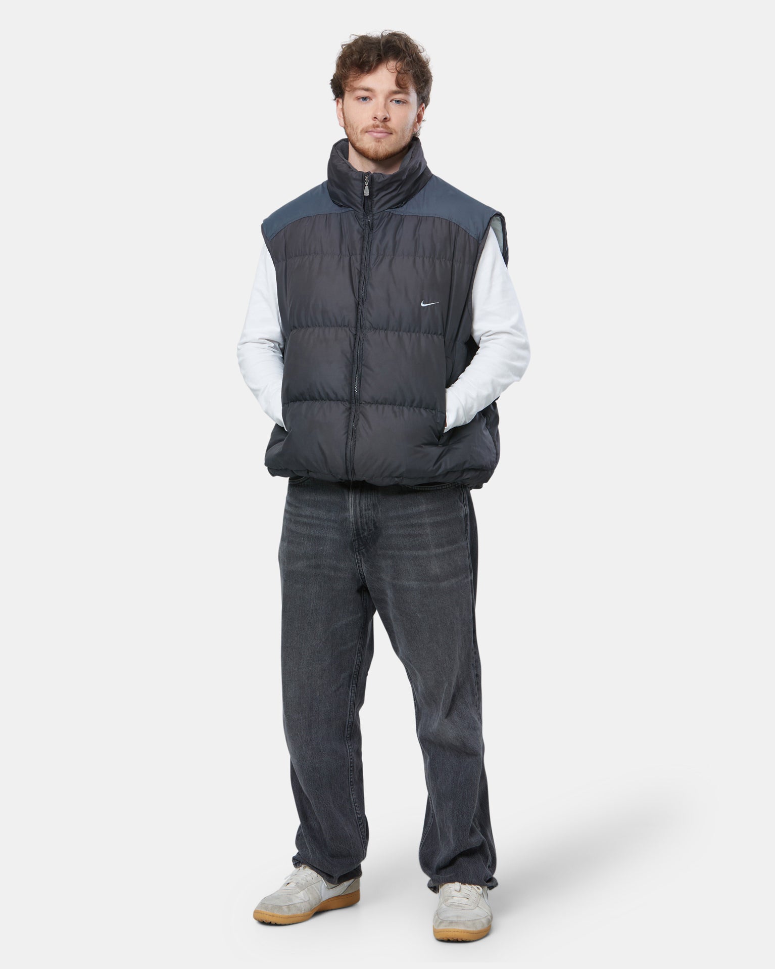 A rare 90’s Nike gilet in a deep black colourway with subtle charcoal paneling across the shoulders and a minimal embroidered swoosh at the chest. Features a full zip closure, high funnel neck, and padded insulation for a warm, structured fit.
