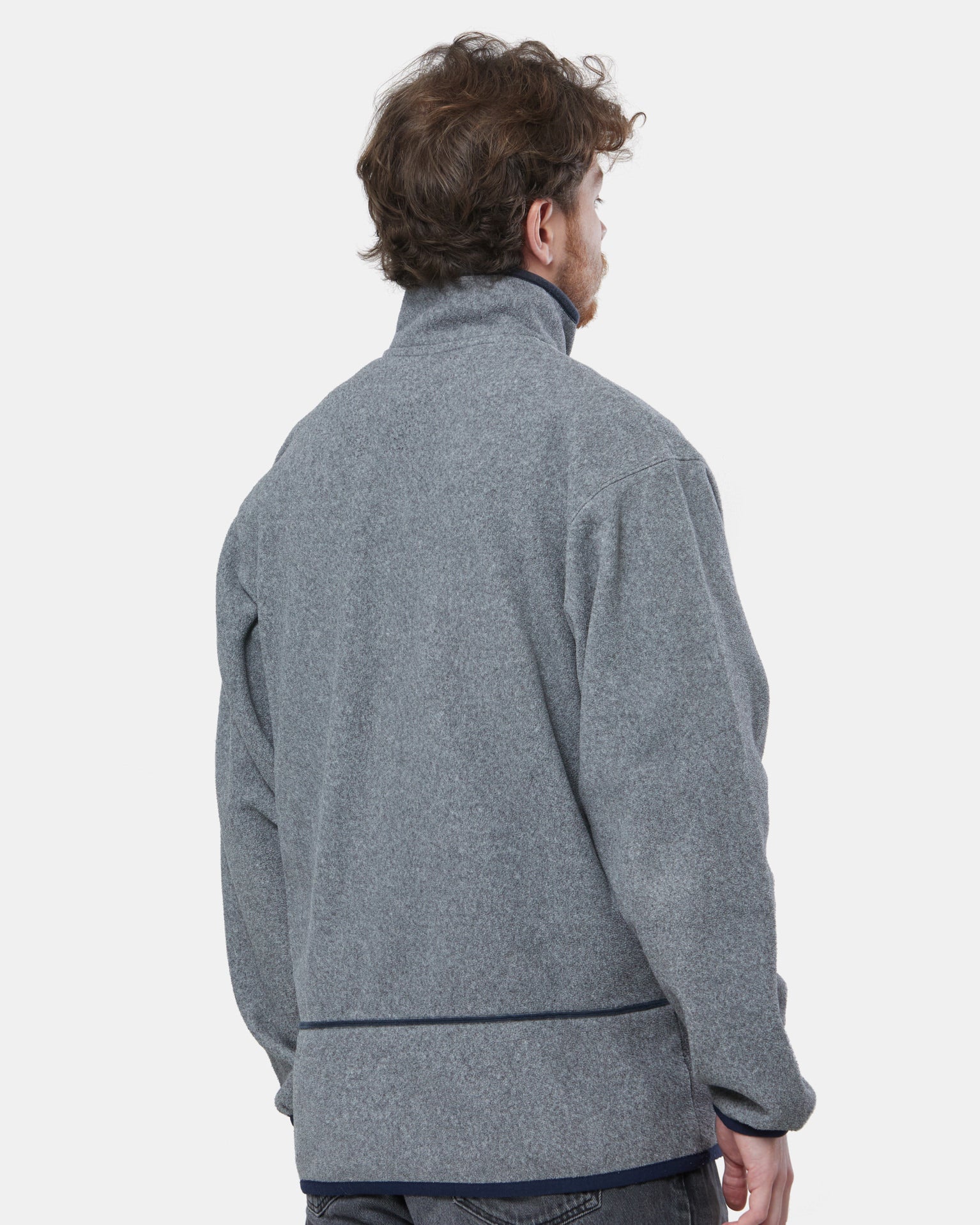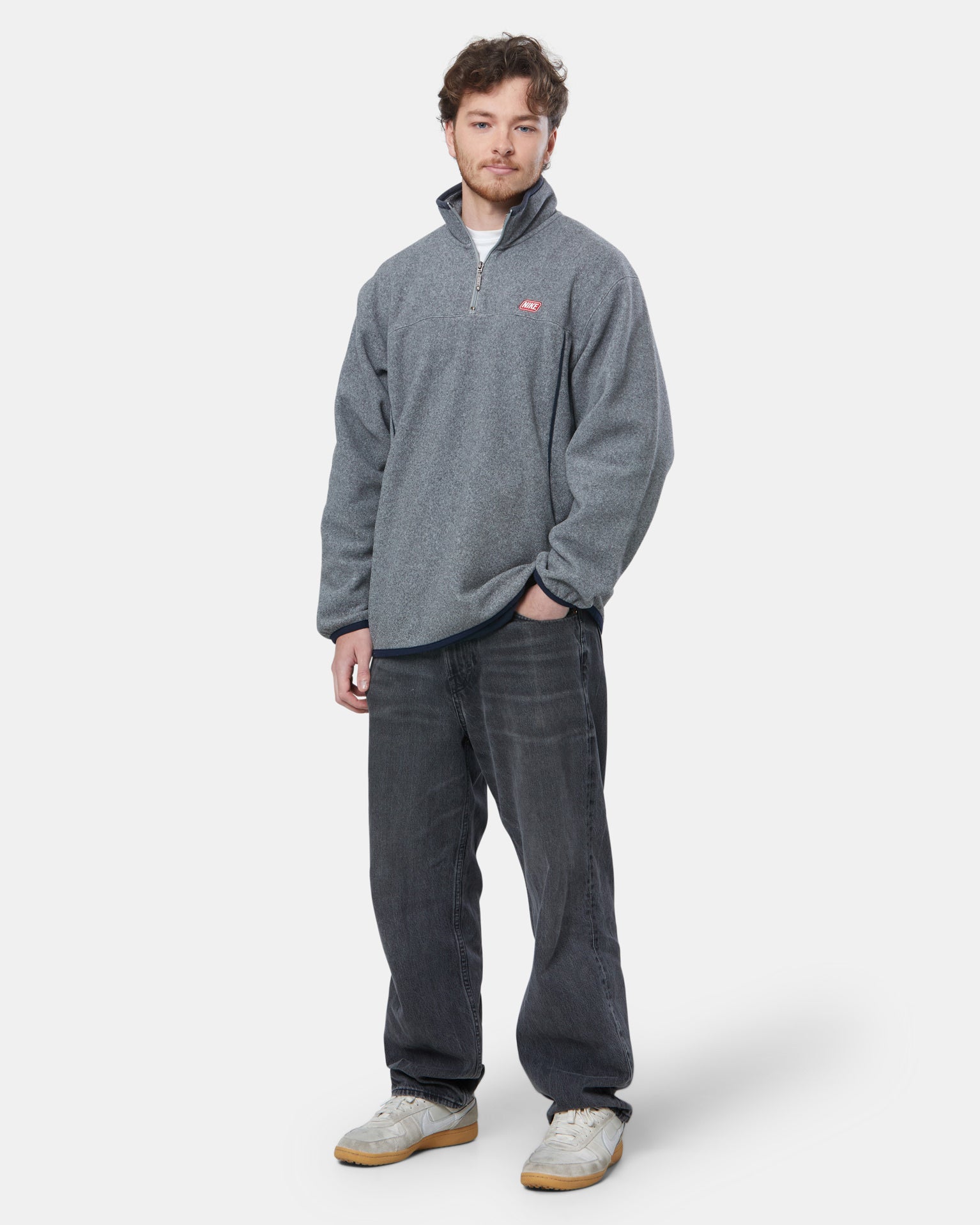 Grey 90s Nike fleece. Features a red embroidered Nike chest logo and zip with iconic Nike branding detailing. A classic sportswear look. Relaxed fit with navy trim detailing, ideal for layering in winter or wearing on its own for an easy everyday look.