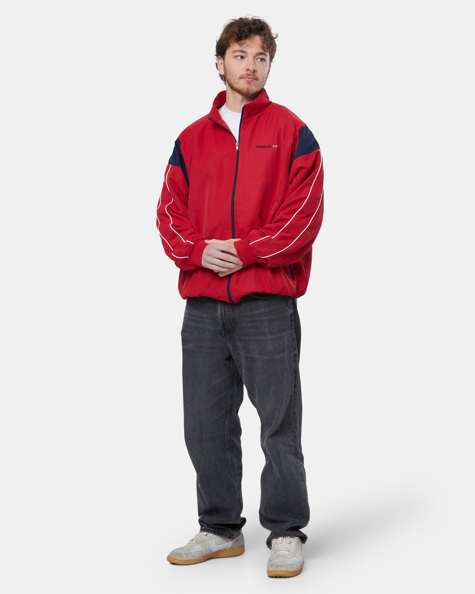 Rare 90s Reebok classic track jacket. Bold red nylon with navy panel detailing and contrast white piping down the sleeves. Subtle embroidered Reebok chest logo, with union jack zip detailing. Unreal back print with oversized Reebok Classic logo. Lightweight, easy to layer and perfect for that relaxed streetwear look.